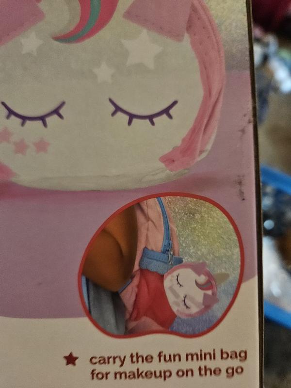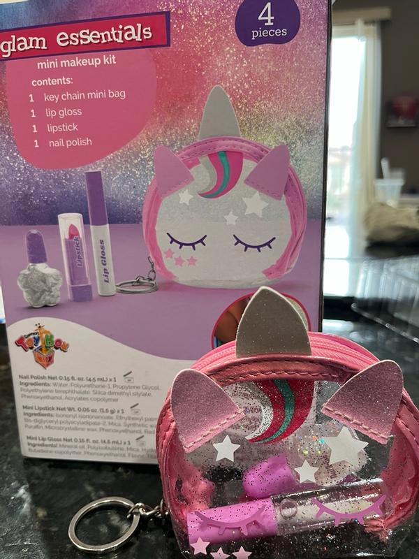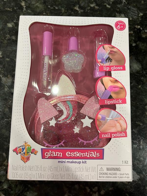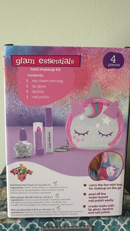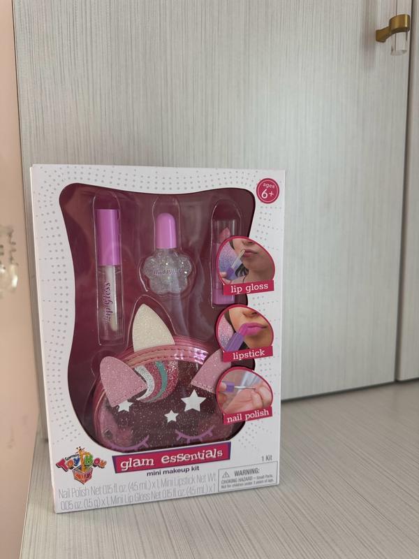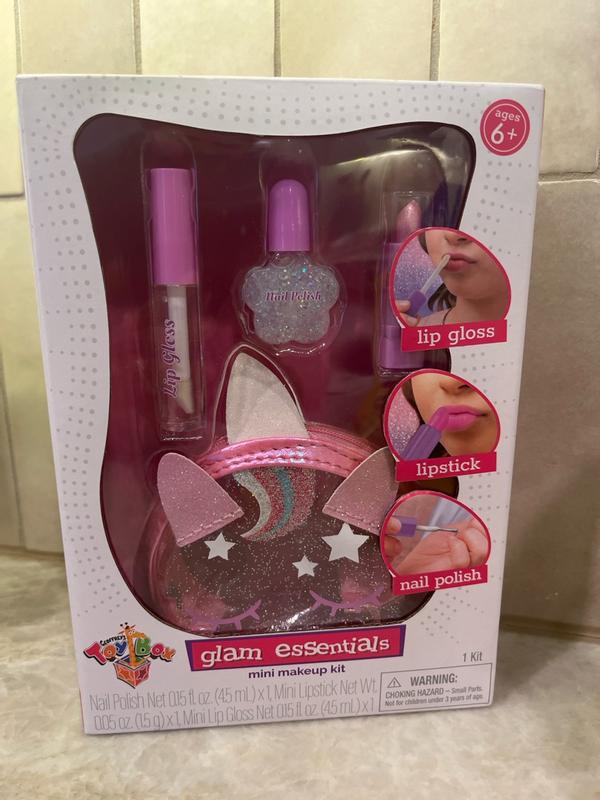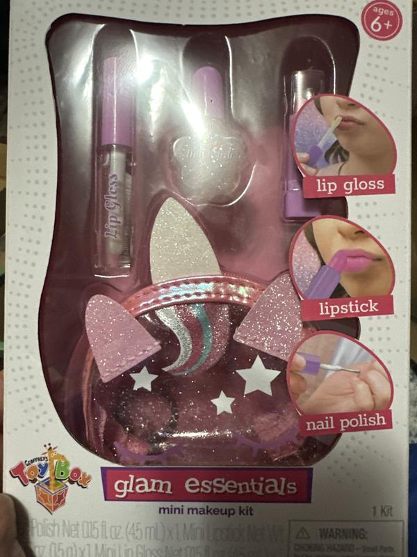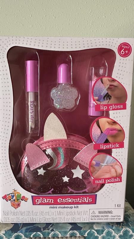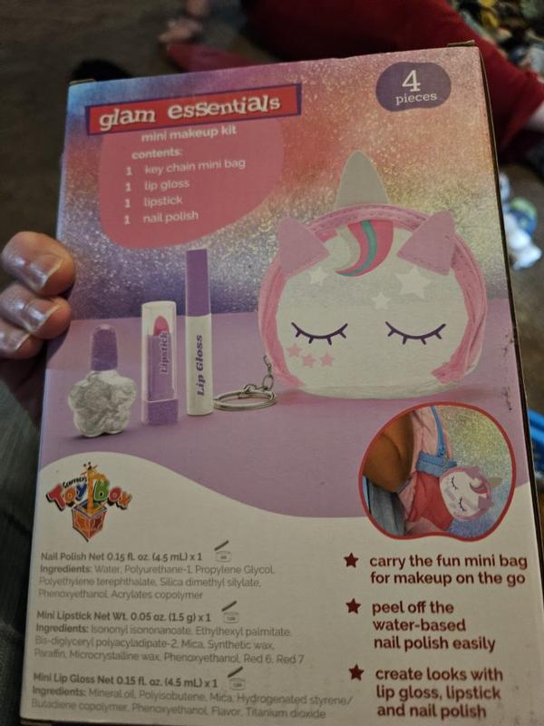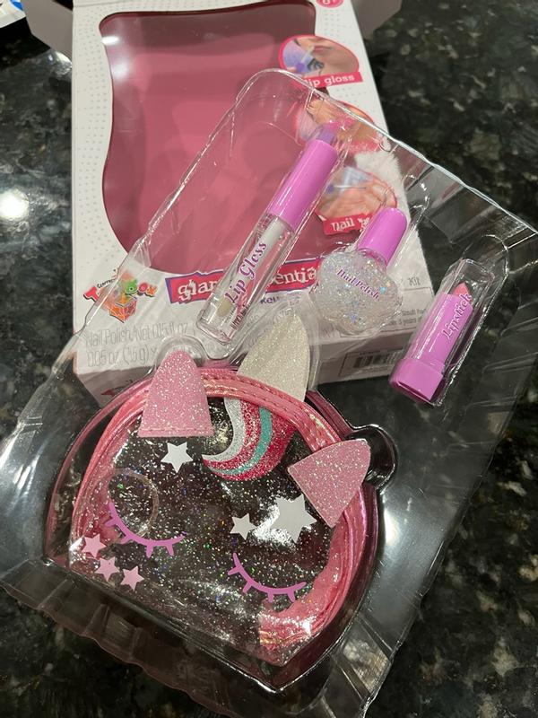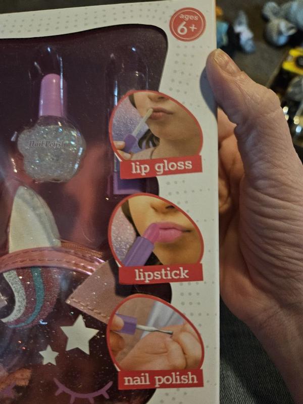 My daughter was so excited to try this and she loved and being a parent I was hoping that it wouldn’t have too much color for my 5 year old and it really doesn’t. The packaging is adorable a cute unicorn bag and I painted her nails with the glitter polish it was easy to use and dried rather quickly. The little pink lipstick is like a pearl iridescent light pink color