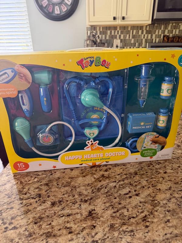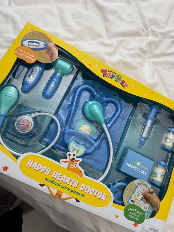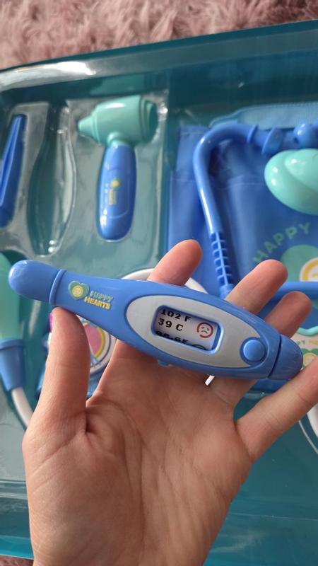 This toy medical care playset is so much fun for playing pretend! The toy thermometer spins, it comes with sticker bandaids to play with, doctor glasses, syringes, ear scope, blood pressure monitor that actually moves around, and more all with a carrying bag to put it in! Perfect for little ones to play doctor with and good quality plastic!