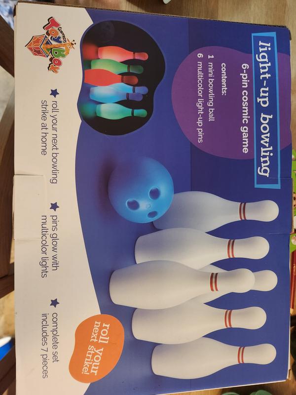 My girls are enjoying this LED light up boiling game they like that they can easily roll the ball and knock down all six pins. I enjoy that they laugh and play this game and that the pins light up in the dark. The whole bowling set up is great for my kids and really cute.