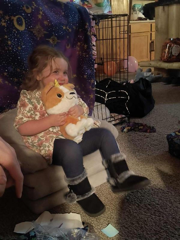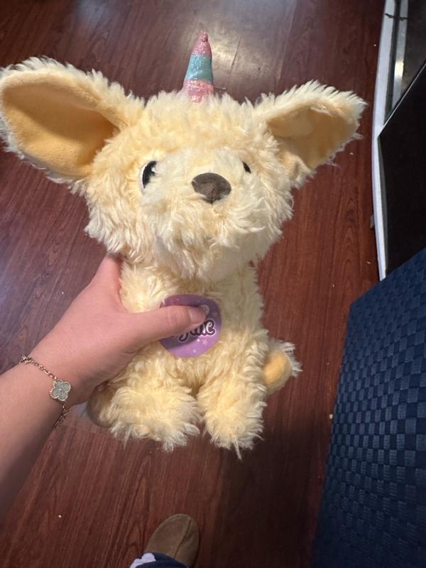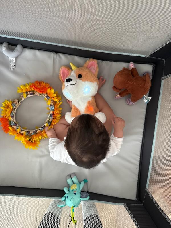 Such an adorable plush, perfect for older babies and toddlers. My niece is in love with her fairy corgi. It has music and barks in a cute way while lights lit up. The size is great, about 12 inches
