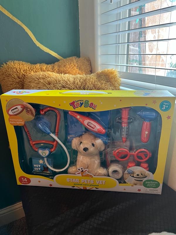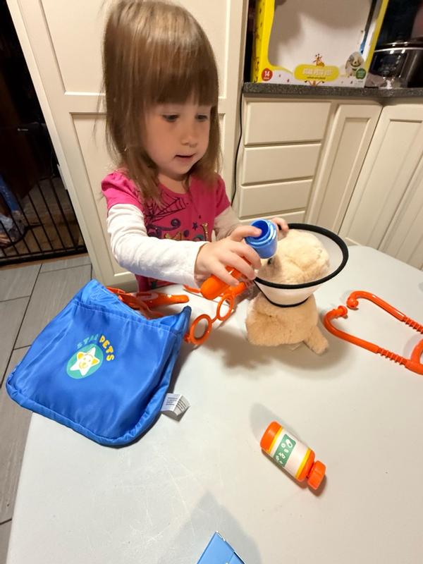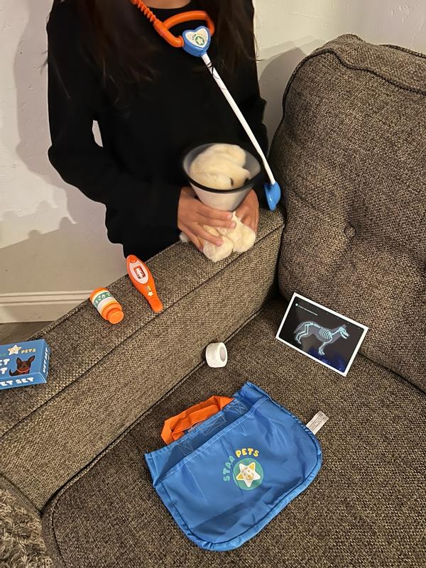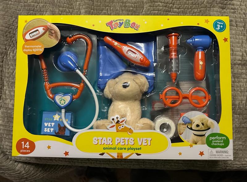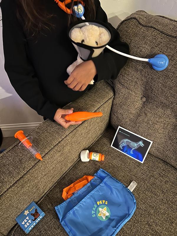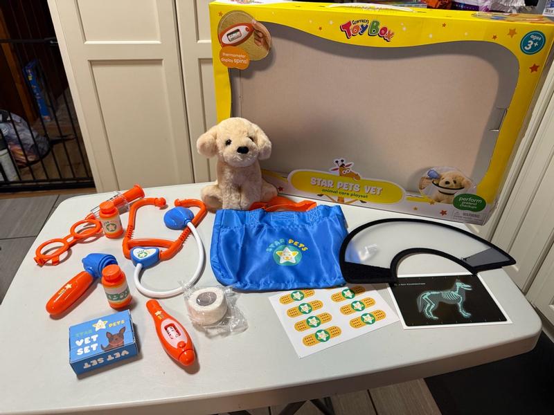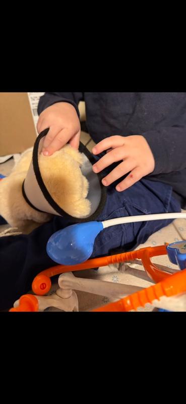 This vet kit is the cutest! My babies love playing with it. Toys are good material not cheep and easy to break. The set has a good variety of “vet tools” for the kids to feel like a real vet. No small toys no assembly.