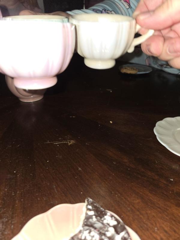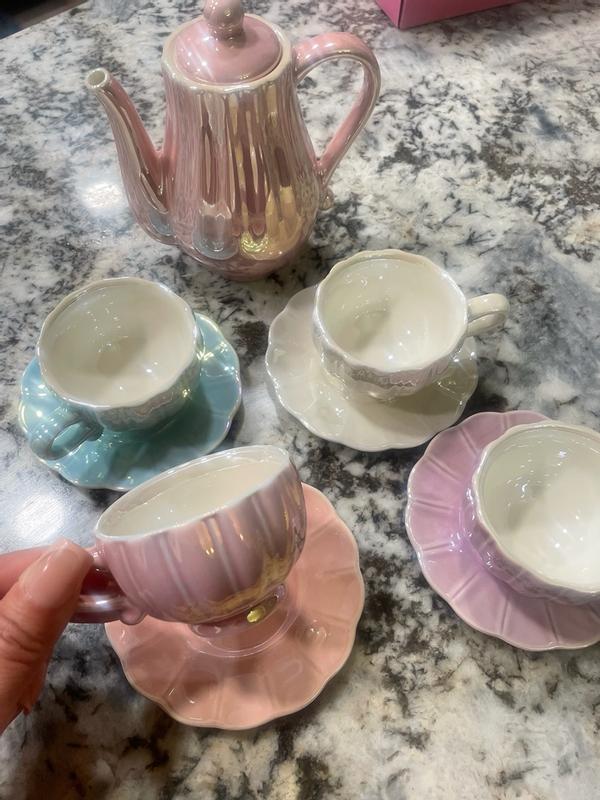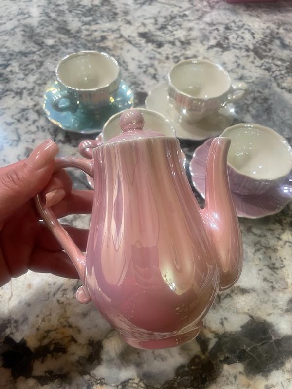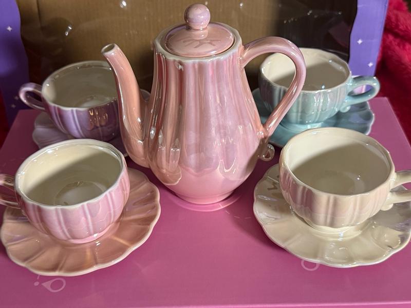This is a very cute teaset, I have put it away for my daughters birthday next year because it is breakable and she is still a little too young for it. It’s great quality and cute colors. I love the shiny aspect. Would recommend for a gift!