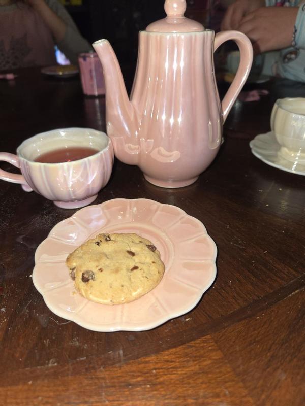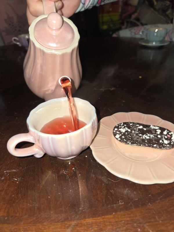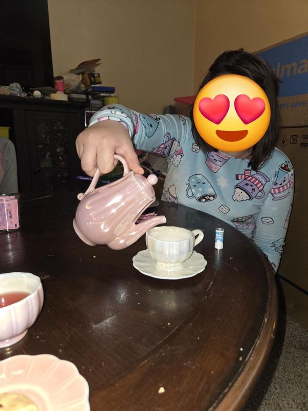 It’s a very nice tea set. Perfect for little hands but be careful, they are breakable. The teapot doesn’t hold enough to fill all cups top but it’s doable. The color scheme is the cutest.