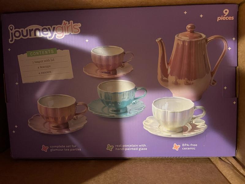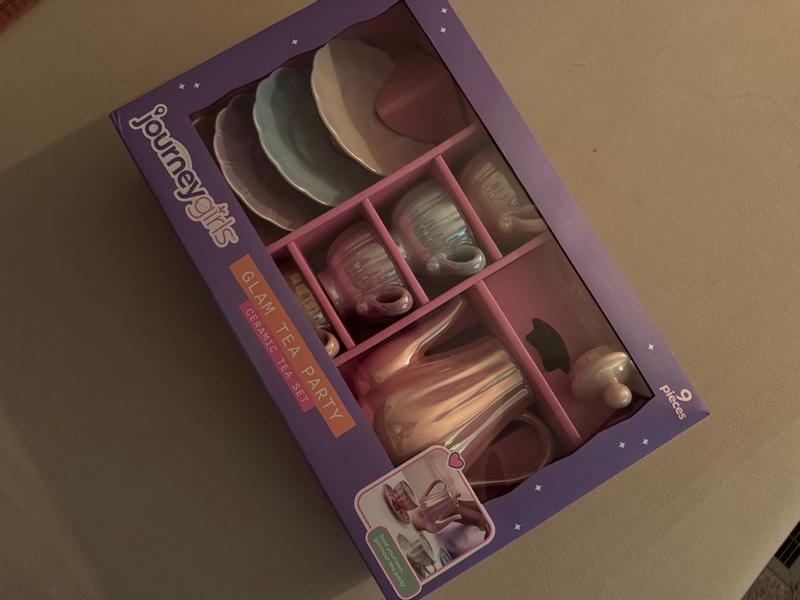 We absolutely love the journey girl Glam Tea Set. We had a lovely tea party. The colors are so nice and shiny.they were super easy to wash i put them on the top rack of the dishwasher. The one complaint i do have is when pouring is it does spill a little if it is full. The cups actually hold a nice size amount of tea. It is endless hours of fun for my kids.