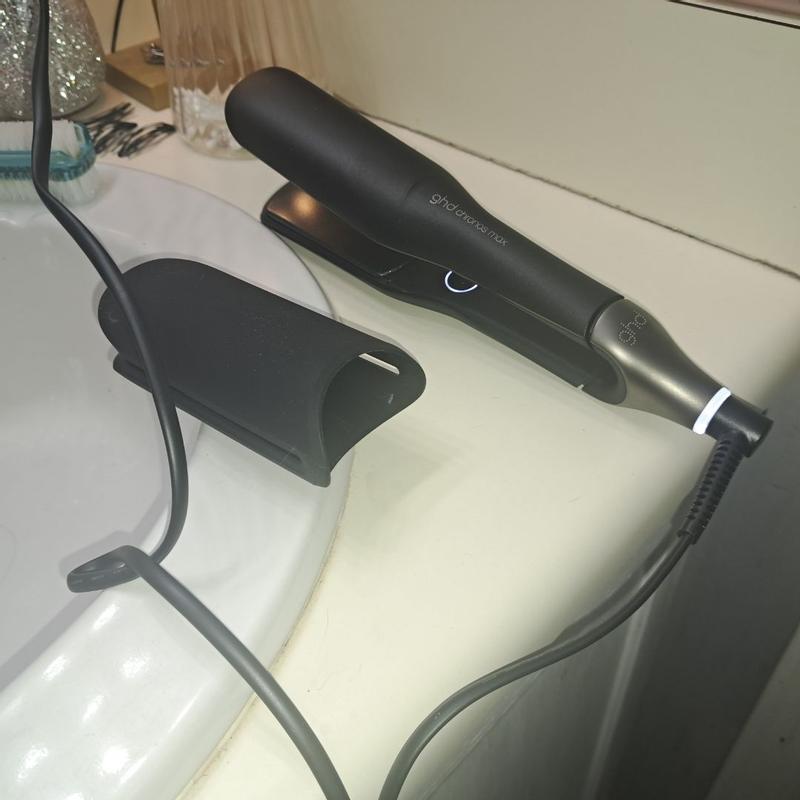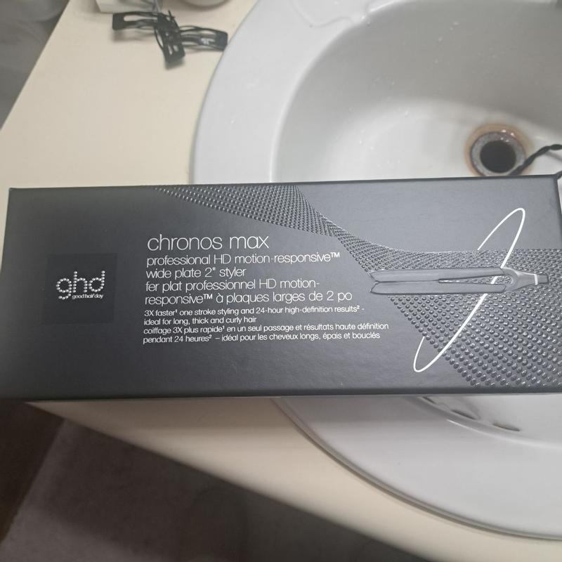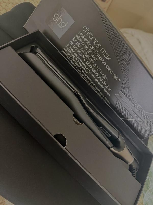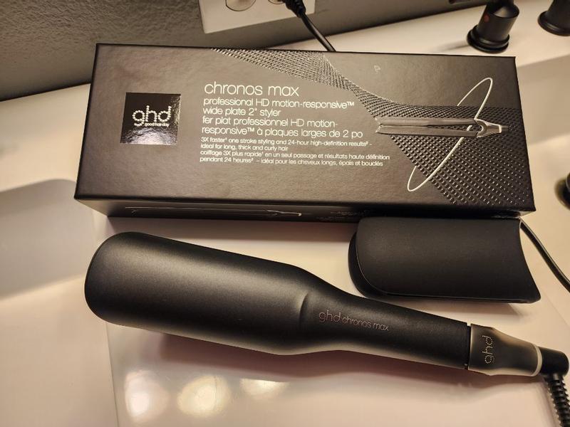 The GHD Chronos max styler has a 2 inch wide flat blade perfect for flat ironing your hair. The blade is extra wide, so it will not roll over on the counter top like some smaller competitors products. It heats up quickly and does a great job getting the waves out of my hair. It also comes with a silicone sleeve to safely cover the blades when you are done using the product. This will be my new go to flat iron. Highly recommend!