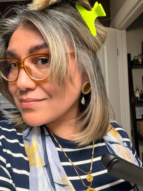 I thought I had a great flat iron until I was introduced to this marvel of a tool! It is light and easy to maneuver because the cord is long and flexible, it twist with you as you move around your hand. The iron doesn’t have a temperature switch but it is motion responsive and it adapts to your hand movement and hair needs. I love that it never leaves my hair extremely hot like my titanium iron does. Its started with one single button and in less than 3 seconds it beeps and it’s ready to use. The plates run smoothly even with heat protection and dry shampoo on my hair. It comes with a short silicone sleeve to protect the top end. As you can tell from my pictures it smoothed and straightened even my most rebellious gray hairs in a matter of a few slides. My hair is left straight yet with body, shiny, smooth and soft. This is going to be my go-to tool during my gray hair growing journey since it helps me avoid frying my and abusing heat as I learn to take care of my grays.