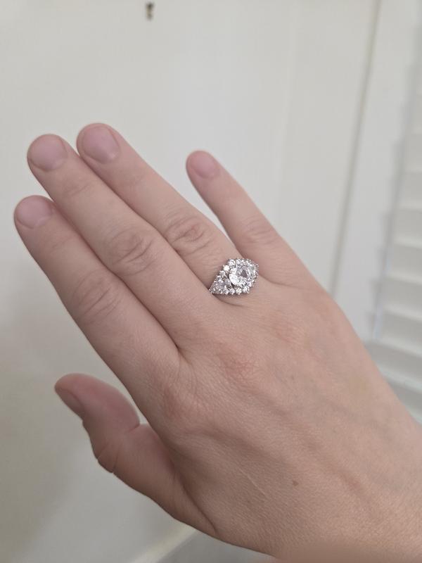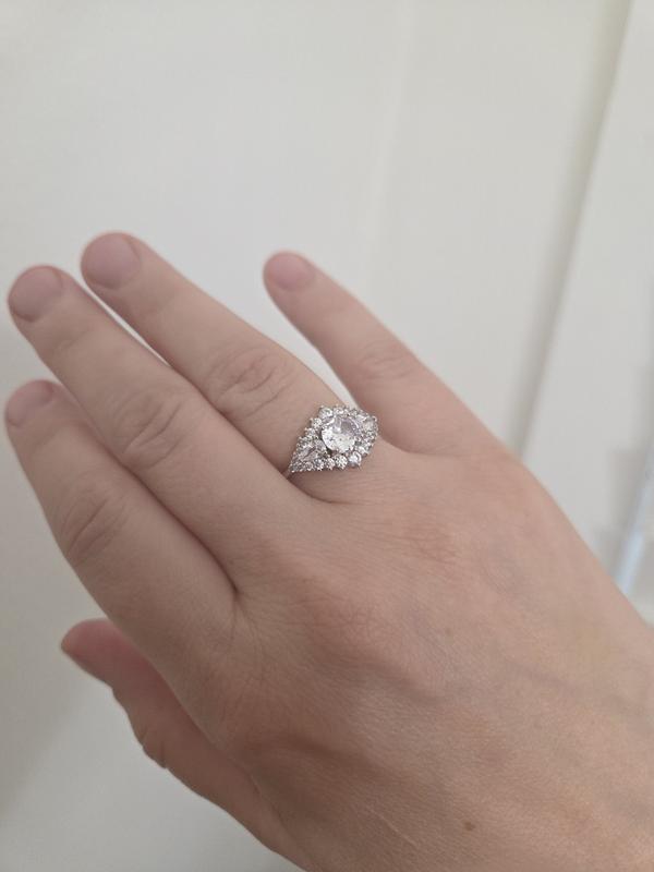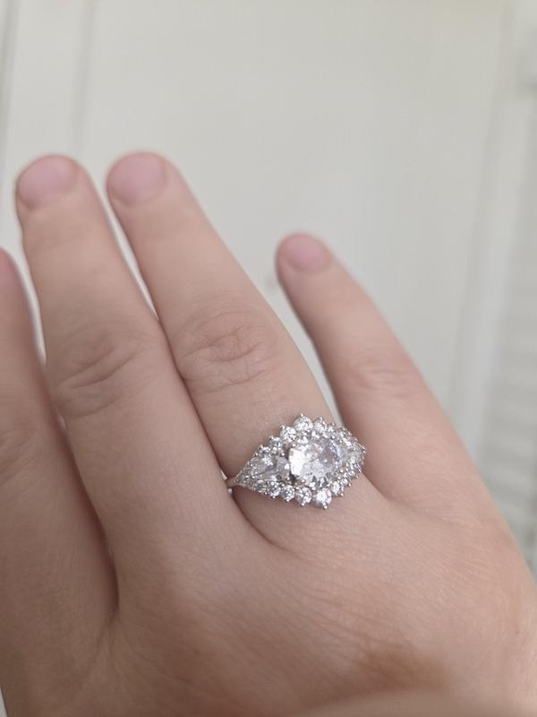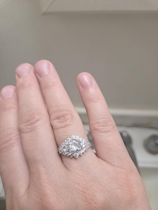 This non-trivial shape looks beautiful on the finger. Stones have a gorgeous shine. The size fits well. Just bought this, online, and I'm enjoying it! I would recommend it.