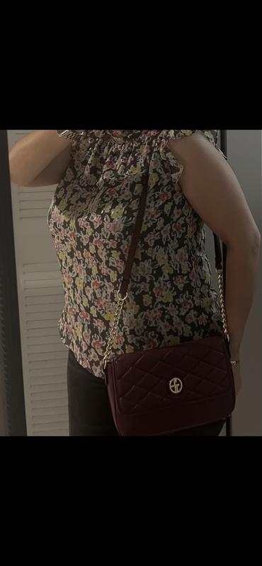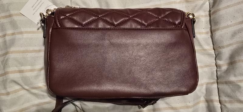 I love this beautiful quilted crossbody bag. The leather-like material is very soft. The maroon color is pretty and can match many outfit. I also love the fact that it has 3 pockets, one under the flap, one on the back of the bag and one with zipper inside the bag. The strap is adjustable so it's good for people of any height. It has a magnetic closure makes it easy to open and close the bag.
