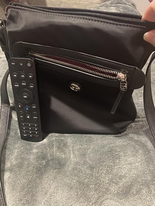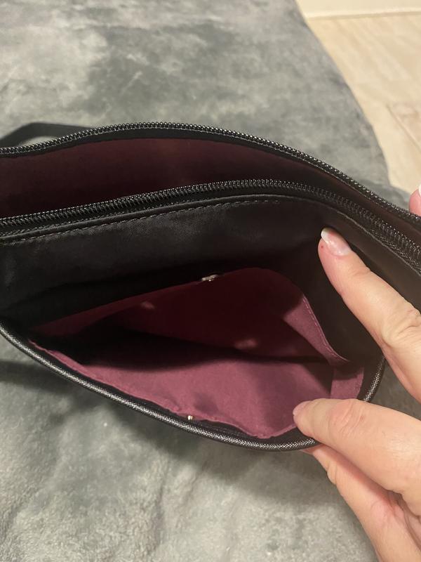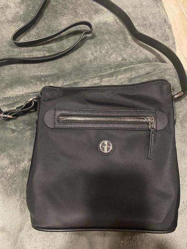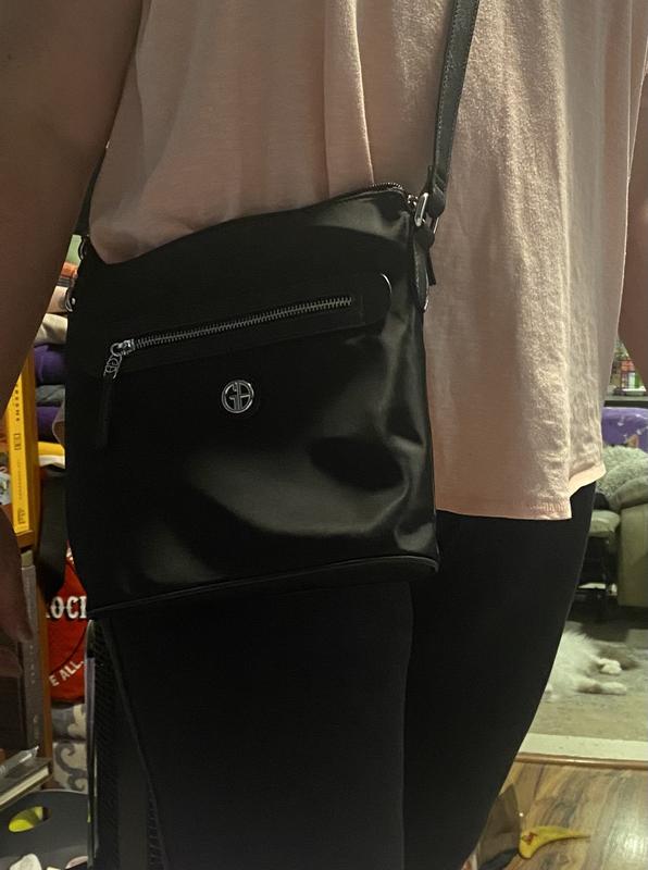 This is a Giani Bernini crossbody purse in black nylon. It’s compact but can hold quite a few things. It’s perfect for traveling. I can fit my phone, glasses , keys and other miscellaneous items. There is a pocket on the inside to hold your phone as well as a zipped pocket for important items. There is an exterior pocket on one side of the purse that is fastened with a snap button and an another exterior pocket with a zipper on the other side. The length of the strap is ajustable and is very comfortable for wearing as an across body. I plan on using this on our next vacation trip. I feel safe having this cross body securely on me, especially around a big crowd of people. Besides being very functional, it is very stylish and will go with any outfit. I love it and will get great use out of it.