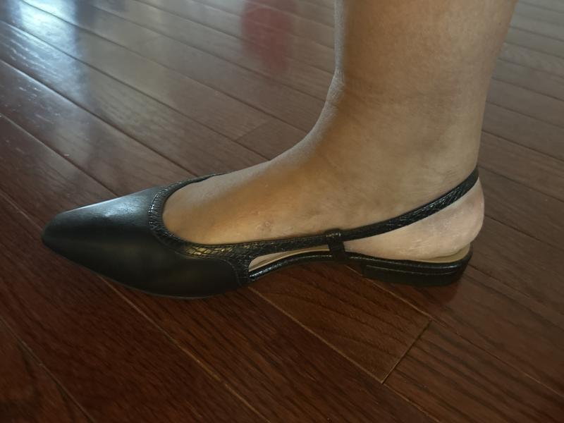 The product received and that which is pictured arebtwo differen items. Nevertheless the item was pretty comforting runs small so it was exact fitting on the heels. Its stylish and perfect flat for long dresses for persons who do not like whole shoes