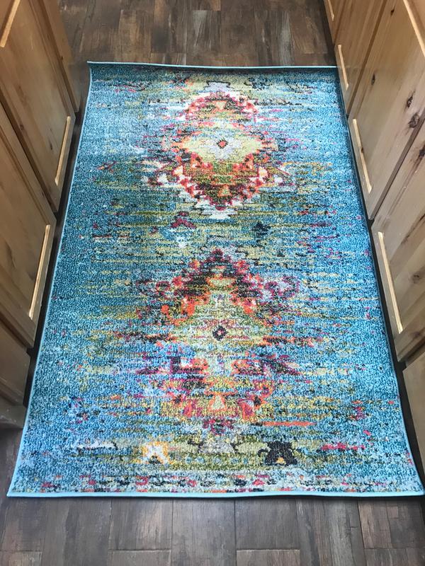 I'm thrilled with the colors in this rug. It goes so well with our boho vibe. The shipping was very speedy and the price was reasonable.