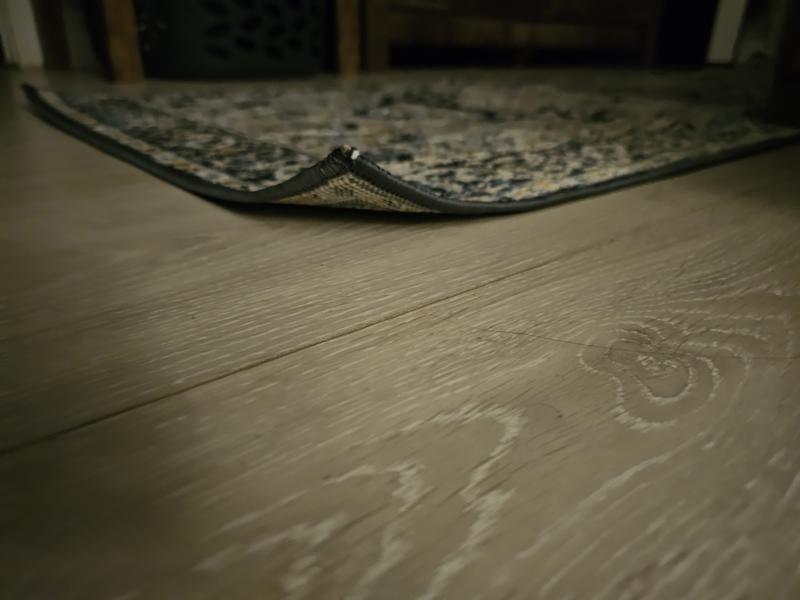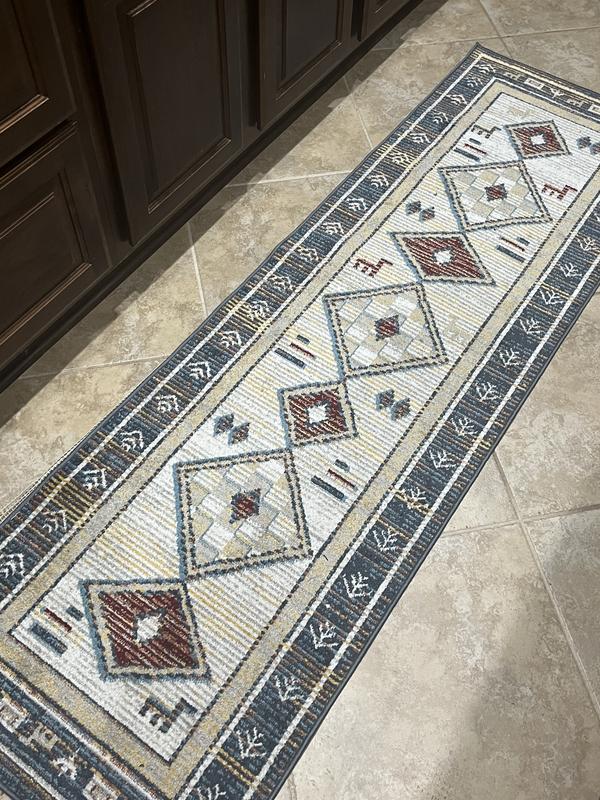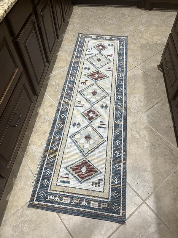 I have the runner version of this rug. I love the pattern and the colors. It’s perfect for the southwest style of our downstairs. I do love that it’s washable but it is thinner than expected. I have it on carpet so it’s fine that it’s not very grippy.