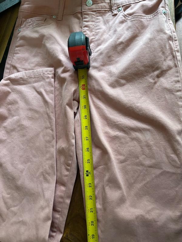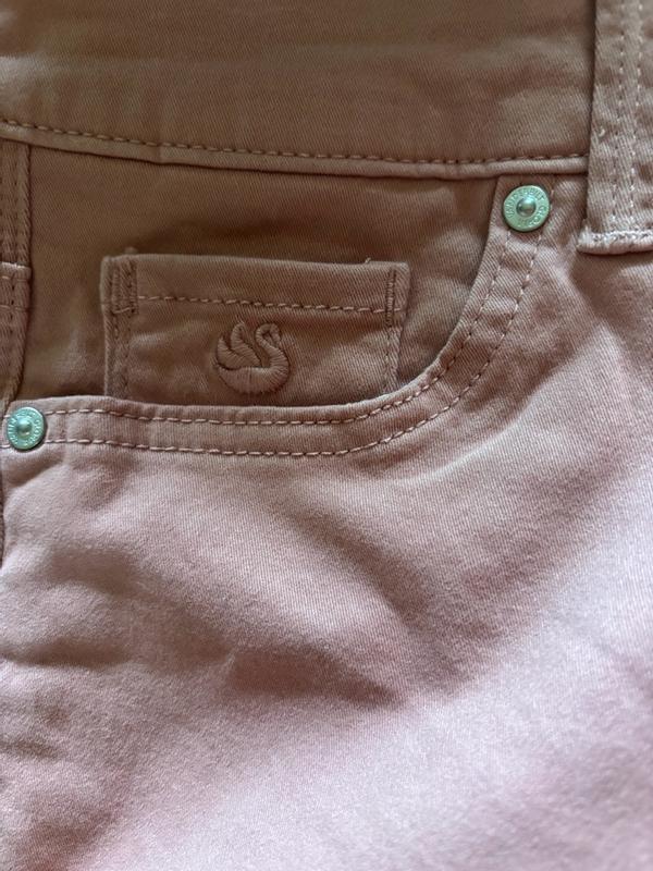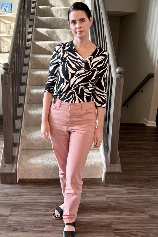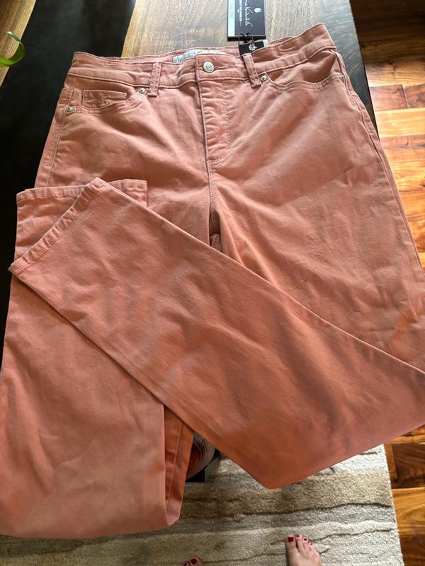 I received these pants compliments of Influenster in exchange for my honest review. They are a beautiful pink shade and very comfortable. They do need to be ironed and they will wrinkle a bit throughout the day. The material does not look like denim but a soft twill. I received a size 10 and I do feel they run slightly large and a bit high waisted for my preference. Overall, they are a very nice and versatile pant.