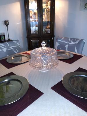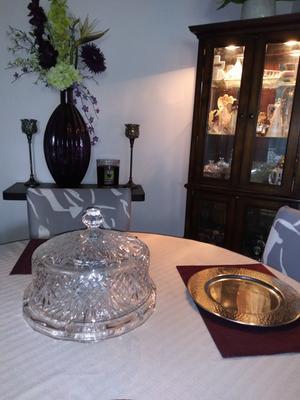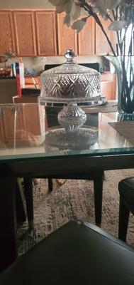 Beautiful, very heavy crystal cake stand and dome. It converts into a chip and dip platter, and also can be used as a punch bowl. Very pretty way to display a cake!