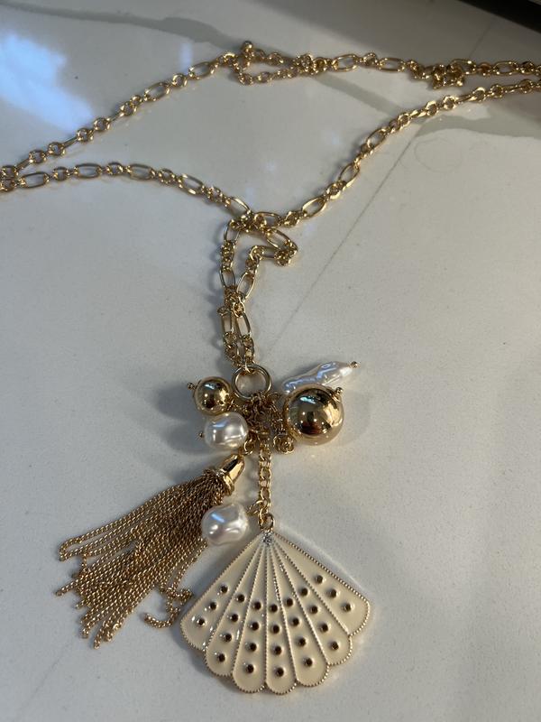Layer on luminous length with this gold-tone necklace finished with beach-inspired charms and imitation shells. This style is part of an exclusive collection with the award-winning costume designer Alix Friedberg. Inspired by her work on Apple TV+ Palm Royale.