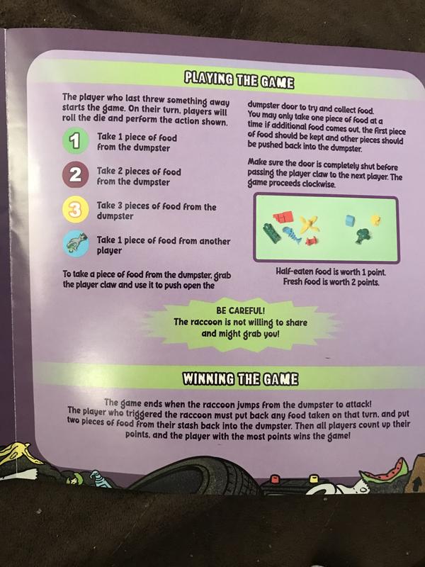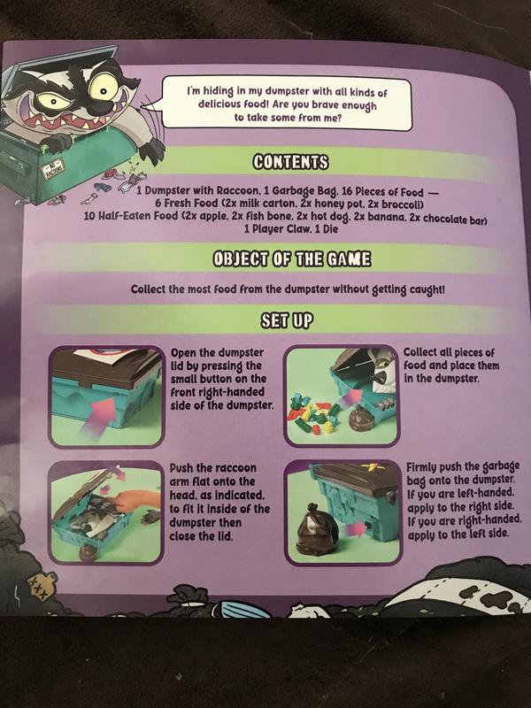 My kids (6 and 10) really enjoy playing this game. Very easy to setup. However I wish the instructions were clearer about where you are supposed to grab the food from. It took us a minute to realize there was a flap at the bottom of the trashcan that you were supposed to open.