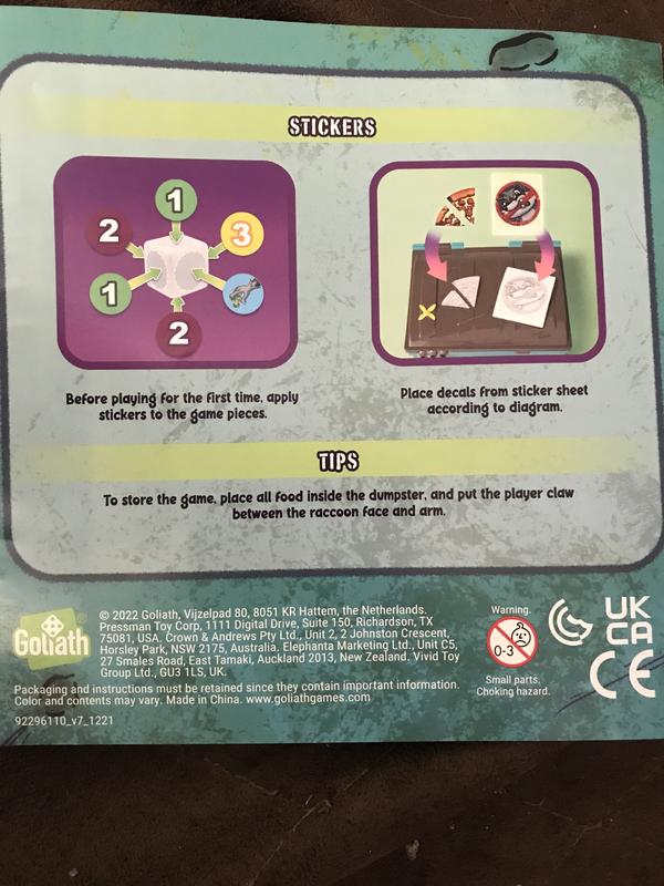 My kids finally opened and started playing this game and now won't stop. This game is great for all age kids. No reading is required and the rules are easy to understand. Pieces are small so maybe supervision for very young kids. It really cute with a little racoon arm to snag the goods. Pieces fit in game for storage.