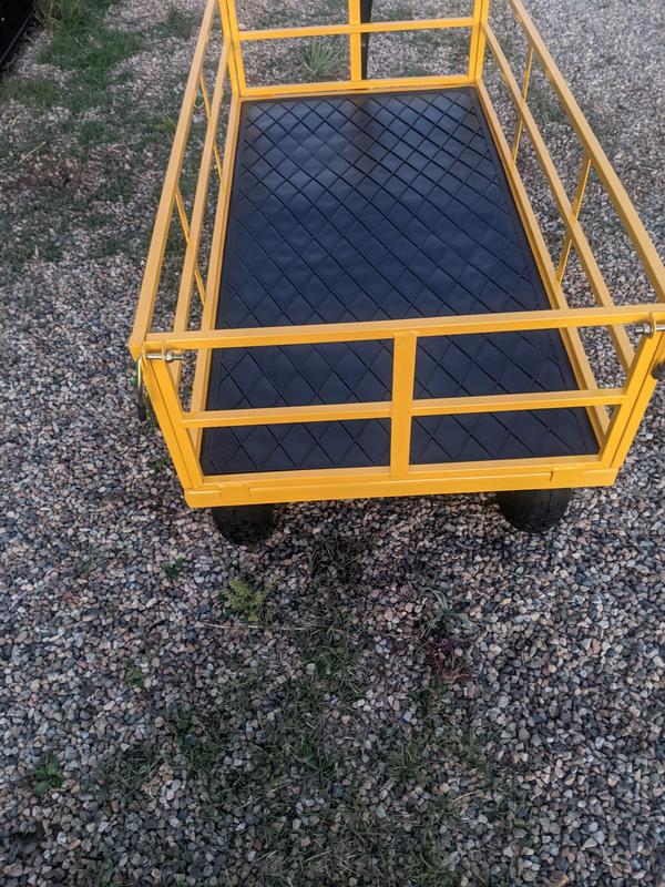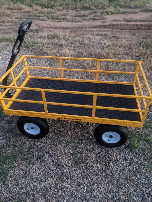 I bought this Gorilla Carts 1200 lb steel utility cart wagon a few weeks ago. It wasn't difficult to assemble. I love that all 4 sides are removable. It's strong enough for heavy projects but is also nice enough to pull my nieces and nephews in (ages 2-8yo). Its sturdy and easy to pull. The wheels turn nice. Overall I'm very happy with my Gorilla Cart.