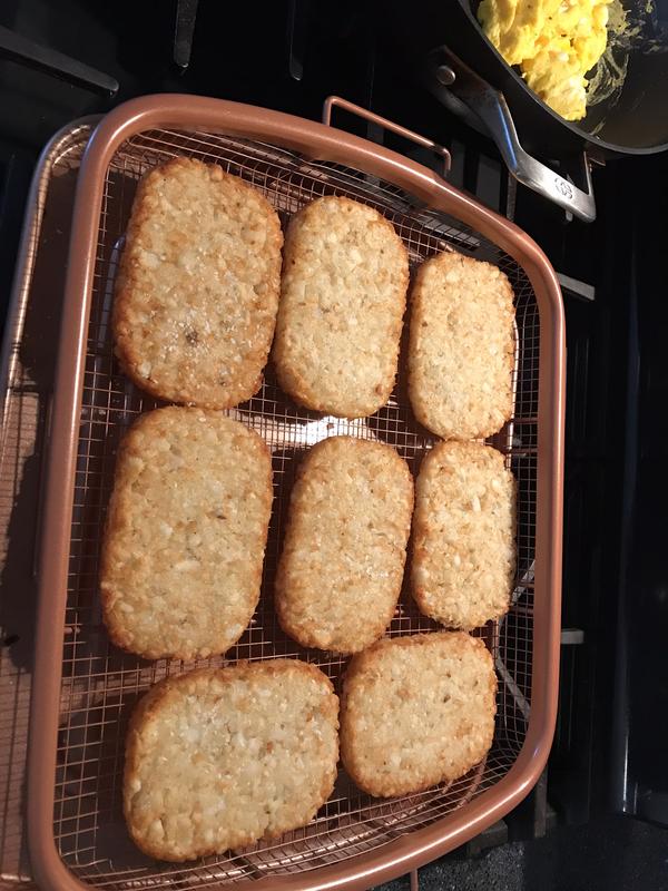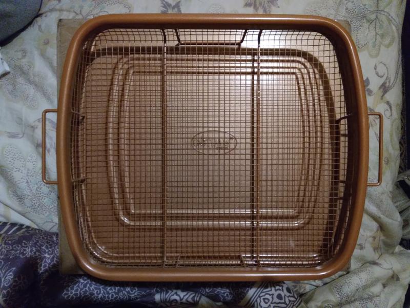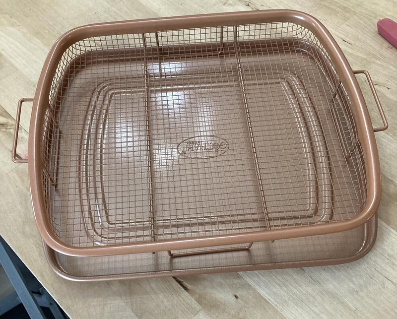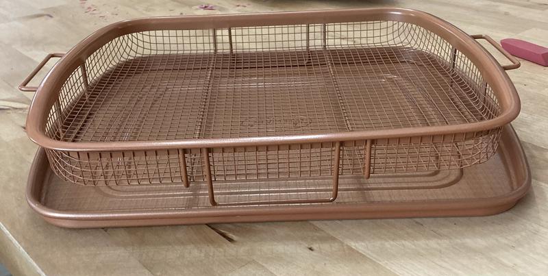 What a great crisping tray to get that crisp food without having to fry it in oil. I love how the tray is elevated to allow the air to flow all through. Sits with a copper tray underneath to catch any crumbs or grease. Food comes out crispy without all the mess. Cooks evenly. Easy to clean.