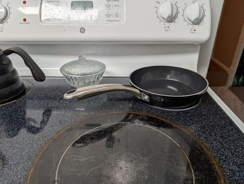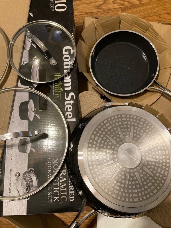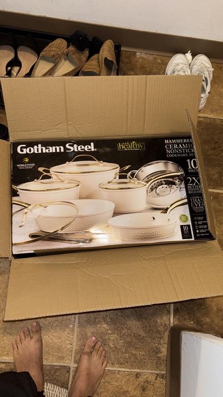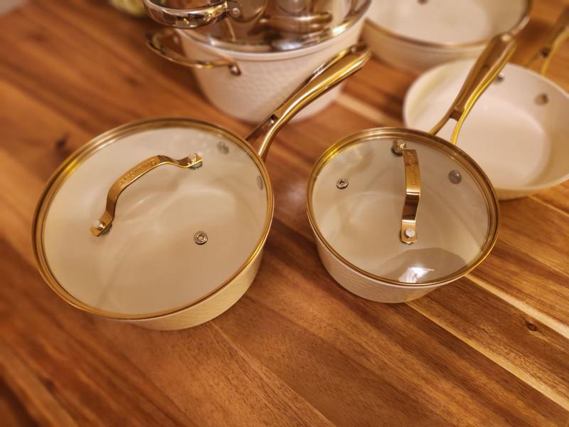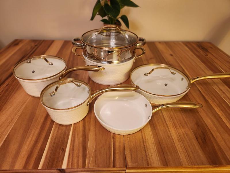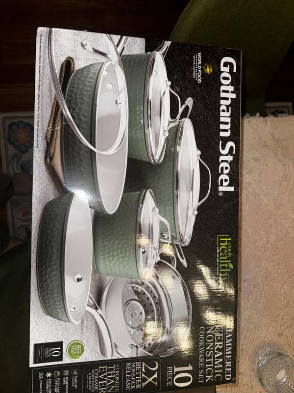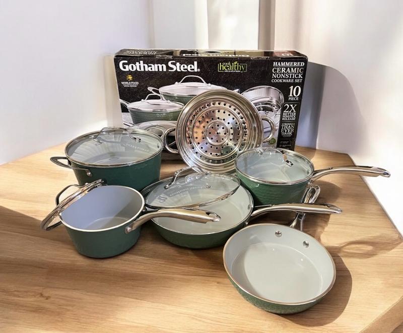 Gotham Steel 10 Piece Hammered Sage Nonstick Ceramic Cookware Set. Absolutely beautiful set, I love this non-stick ceramic pots and pans set that meets all my needs for everyday cooking. This set design is very elegant, lightweight, and easy to use. The ceramic coating is great for nonstick, retains heat very well, and is easy to clean. If the fitting/fastener were located outside would be better to use the whole surface of the cookware.