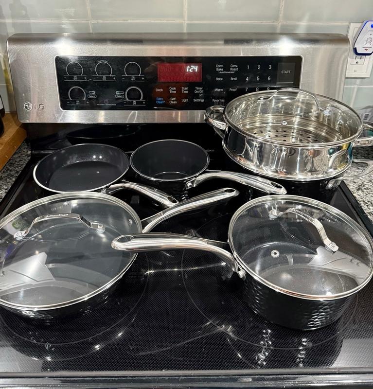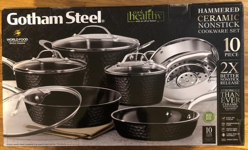 The Gotham Steel 10 pieces Hammered Black Nonstick Ceramic Cookware Set is an excellent product. The pans are ceramic, allowing them to be light yet durable, while black-and-silver design is aesthetically pleasing. The heat is very even, and the pans don’t require oil, allowing for savings and healthiness at the same time. It cooks very quickly and evenly, super easy to clean. Highly recommend!
