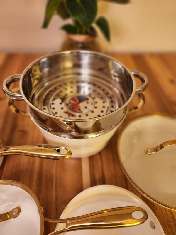 This cookware from Gotham Steel is immediately eye catching with it’s cream exterior and polished gold handles. It gives off that expensive feel without the crazy expensive price tag attached. My first thought when I picked one up was how light weight each piece is. The hammered style is also very visually appealing. My favorite thing about this set is the steaming basket that fits perfectly into the large pot. It also works exceptionally well at straining. I also really liked that they are dishwasher safe. Some concerns I noted are that these are not very heavy duty and I noticed small, but visible chips in the color immediately after unpacking. The cream color dis-colors quickly depending on the type of food you are cooking and despite the non-stick claim, most things do stick to an extent. Overall, they work well and look great!