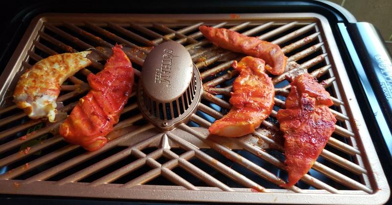 The best feature about this grill is the fan. It sounds loud but there was no smoke when I used it. I grilled a piece of chicken breast in about 20 minutes. I had marinated it 24 hours before cooking. It was tender and flavorful. The grill is easy to clean with soap and a nylon scrubber. The only downside of the product is I do not have enough storage space for it.
