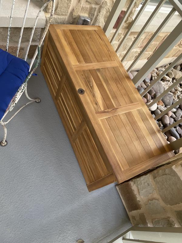 Crafted from durable acacia wood with a teak oil finish, this storage bench offers a stylish solution for organizing outdoor items. Its large storage space and versatile design make it perfect for any backyard, garden, or porch.