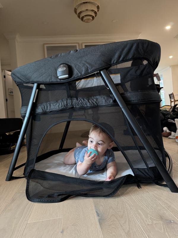 I was given this playard to try as part of the Stellar Product Testing Panel and we love it so much. This is a sleek and modern looking pack n'play that is compact enough to fit in small spaces, but still gives our baby enough room to play or sleep. We recently took it with us on a trip abroad and my 9-month-old son slept so well in it for 10 nights. My son got sick while on the trip and as a bonus we even learned how easy the mattress is to clean liquids out of. One of our flights was delayed so we even opened up the playard in the airport so my son had a safe place to play. It's super easy to open and pack away which was very convenient for airport use. We've had two other pack n'plays in the past and this is by far the easiest to set up and break down. I'm excited for this to be our new go-to pack n'play and for it to grow with our family!