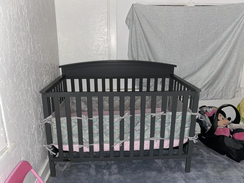 This crib says its 4-in-1 meaning in order to convert the crib to a toddler bed you have to take off the front panel. After I spoke with the manufacturing company they informed me that this crib isn't compatible with any rails. So your toddler can just roll right off the bed. That's the "conversion". Real safe. Never buying Graco or Storkcraft again!!