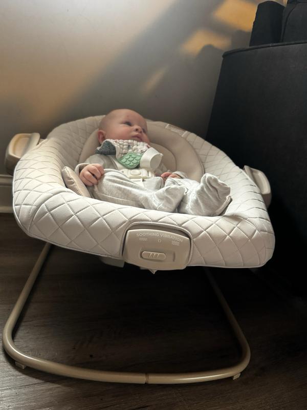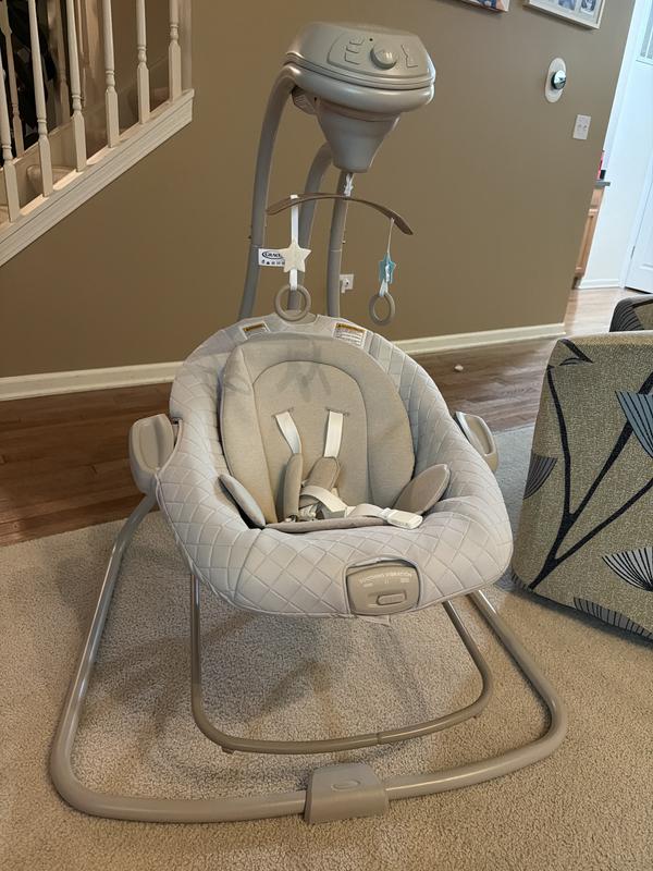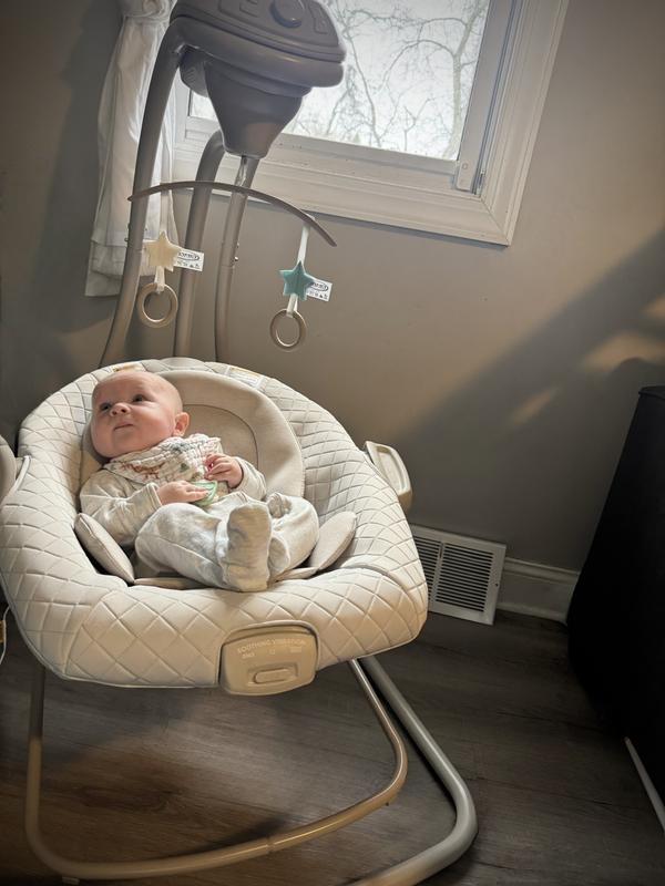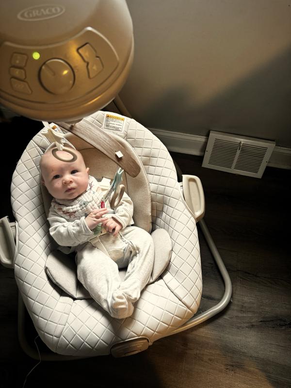 I was given the Graco DuetConnect LX Swing to try out and review as part of the Stellar Product Testing Panel! As a mother of a 3 month old, I was so excited to be chosen to add this swing to our day to day experience! The packaging successfully protected the product in transport. The cool toned beige color of the swing unit is the perfect shade to allow it to seamlessly integrate into any decor. I was really impressed by the premium feeling quilted fabrics on the seat! When I went to assemble the unit, this was the worst part of the product. As a very visual person, I found the illustrations and instructions (specifically for seat assembly) so confusing and unhelpful. I had to find a video online and that was much more helpful. It took me a very long time to get the seat together and then when the foot of the removable bouncer seat was uneven, the I re assembled it two more times just to be sure I had it right and it was still unlevel but with the weight of my baby in the bouncer it fixed the problem when in use. I will also say that the entire unit is a little bulkier in size than I had anticipated. I feel in order for the swing to be adequately usable you should plan to have a square 4ft x 4ft earmarked for this to allow for the swing to correctly have enough space. Once assembled, the swinging feature works smoothly even for my larger baby (90th percentile baby for height and weight) he still has plenty of room! When I placed the baby in the swing for the first time he was so fussy but as soon as I turned on the swing he calmed right down! I was shocked. And whenever he isn’t instantly soothed, there is an additional vibration mode on the seat that sealed the deal and seemed to soothe him the most! (Runs on a separate D battery so it will work even when you remove the seat and take it to another room as the bouncer mode) The control panel includes music as well as nature sounds (both with volume control) and my baby enjoyed both modes. The detachable seat has been a godsend to be able to quickly move room to room with the baby and have a place to safely secure them in a 5 point harness when getting household chores done. The swing unit is powered by plug in OR battery which gives people options for placement. All and all the footprint size needed for function and the assembly experience had me feeling very negative about the product, however, the ultimate reviewer: my baby, loved it. It has calmed him down many times I will happily endorse it! My major tip is do yourself a favor and find an assembly video online initially and I suspect you will have a better assembly experience!