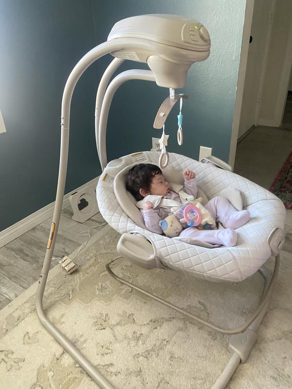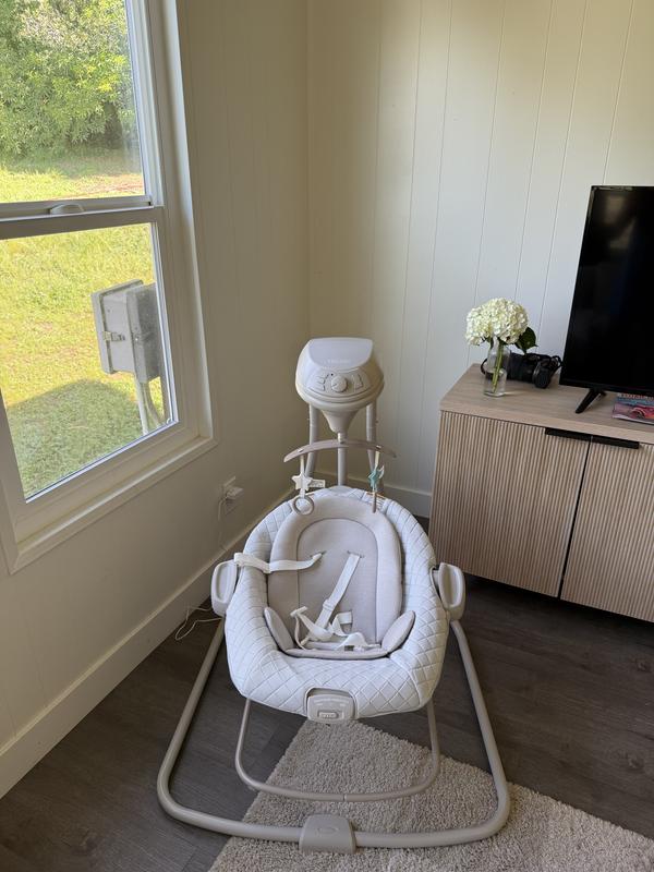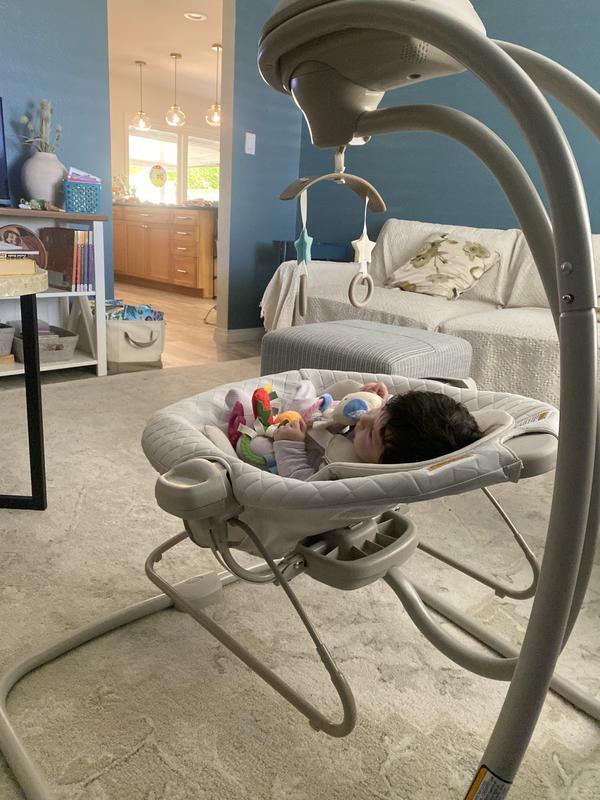 My baby loves the Grace DuetConnect LX, which makes my day with an infant infinitely easier. I’m thrilled that the multiple speeds hit the right one to keep baby relaxed nearby while I care for other kids or do computer work, and the moveable bouncer feature gives her a comfy seat when we move to another room. Even though the swing includes all of the features I wish for (nice sounds and music with flexible volume control), the size still fits nicely in my small sitting room. Plus the simple, neutral design is soothing to baby and elegant with my room. The only negative with this swing is the initial assembly, but once assembled I love using it every day. I’m thankful to Stellar testing panel for providing me with this swing!