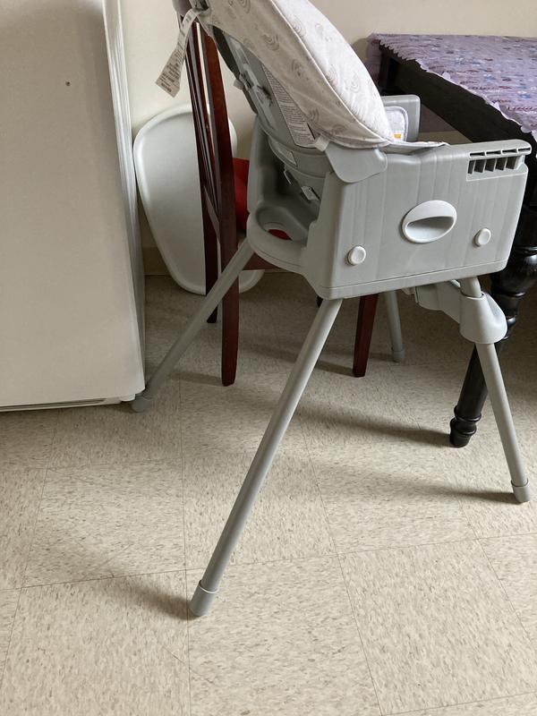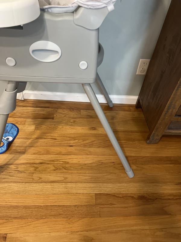 I love the high chair itself, but the legs are awkward, they stick out too far in the back I have tripped over it several times and it does damage to the toes. The legs need to be straight up and down ,not at an angle. I have to sit it in another room so everyone can stop falling over it