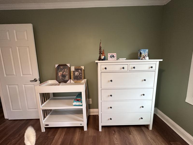 We love this changing table. Lots of room for storage. Very sturdy. And it’s the perfect height. Highly recommend.