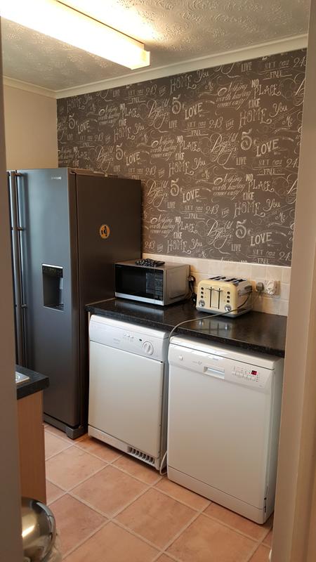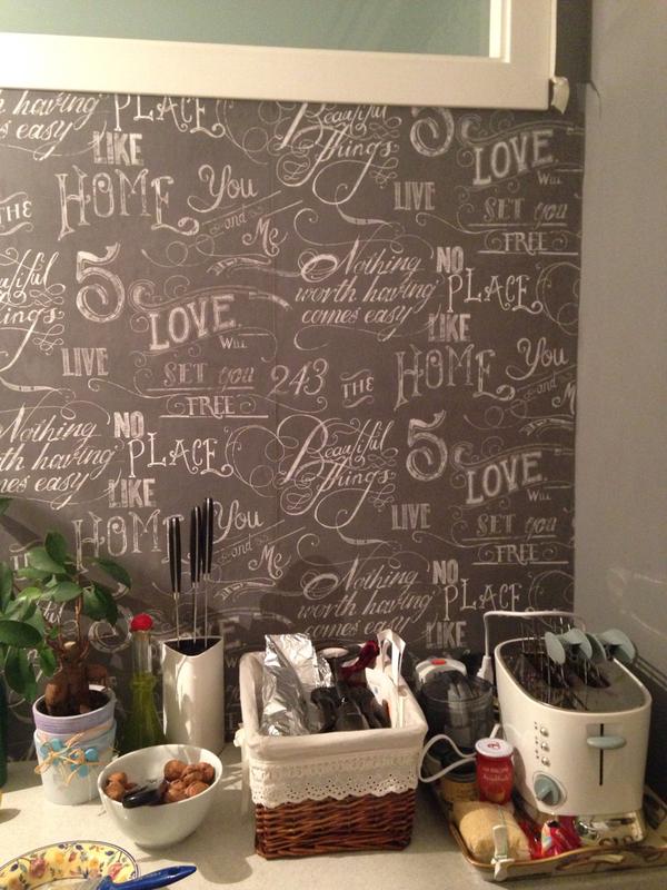 I bought this paper over Easter break. I loved getting the great price! I also like the chalkboard look. I have black and white tiles in my kitchen, so a pattern on the wall was too much. This paper gave me an alternative.