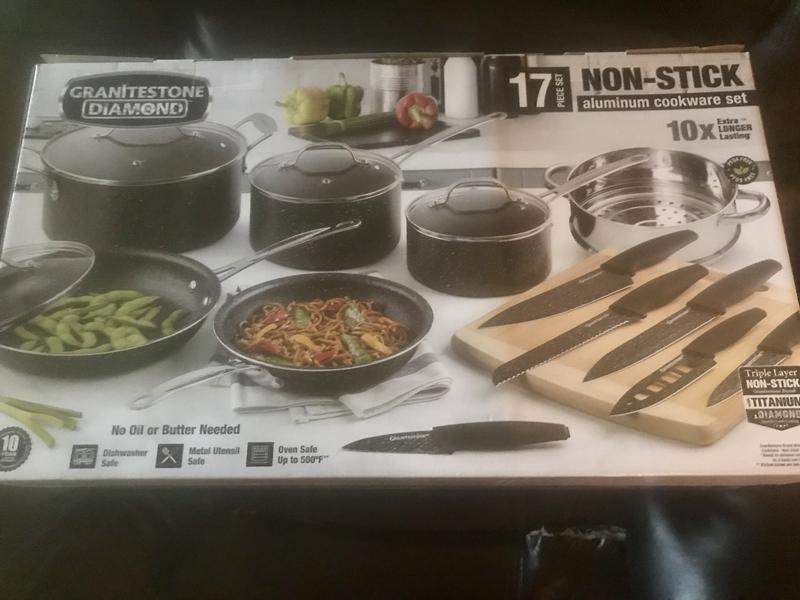 Granitestone 17 Piece Cookware Set is made well, nice and sturdy, doesn’t scratch, color is nice. Dishwasher and oven safe up to 500 degrees, has stay cool handles. The knives are made well too, nice and sharp and fit well into a spare butcher block that I had laying around. Definitely my new favorite cookware.