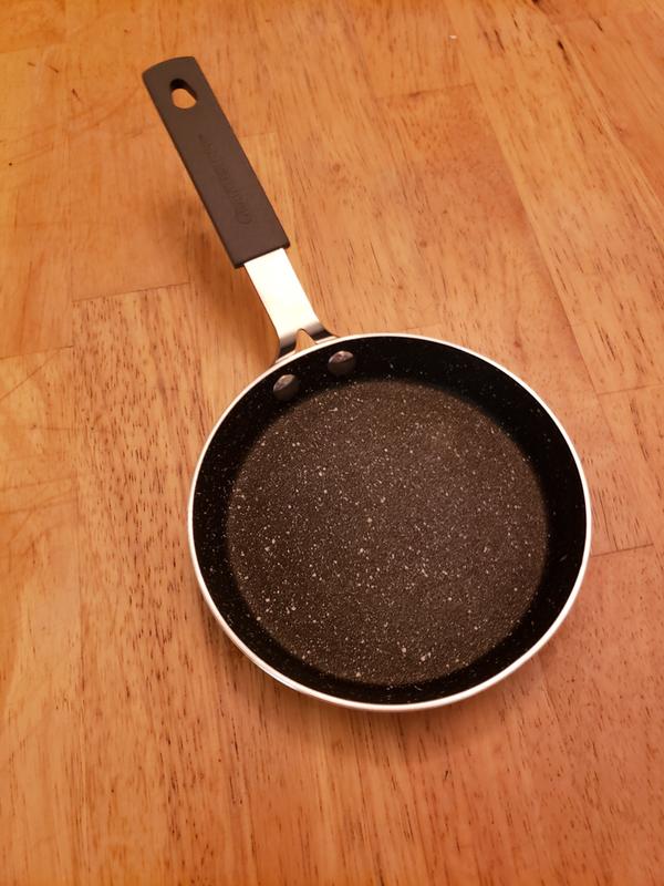 I got this a couple of weeks ago and used it today to cook a couple eggs. Many times I want just a small breakfast for myself and don't want to use a big pan where the yolk slides and the eggs cook unevenly. You can see from the photos the two eggs fit perfectly in the pan and cooked evenly. The third picture shows how cleanly the eggs slid out ot the pan - leaving nothing behind. The small pan cooked the eggs perfectly for a sandwich on toast or like I had - on an english muffin. I like that this is handwash or dishwash safe. I would definitely look into other size pans by this brand.