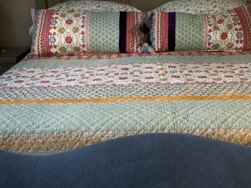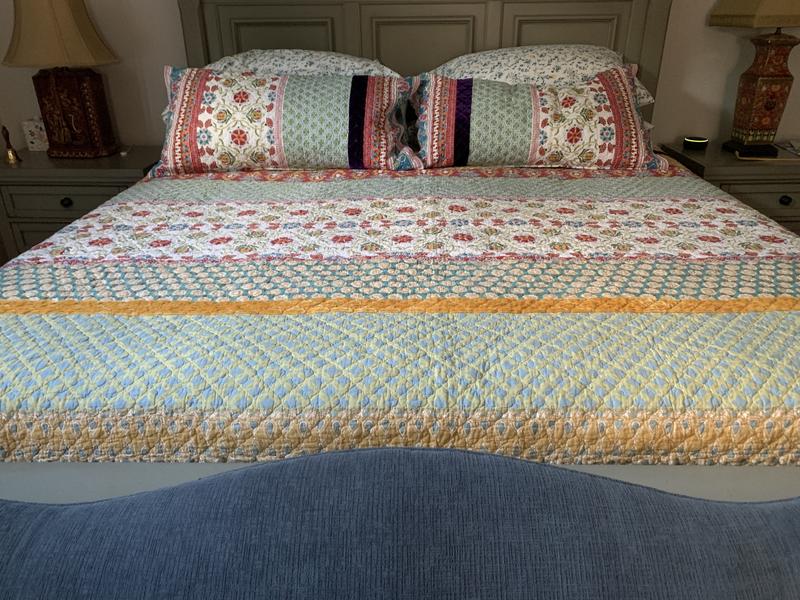 Colorful quilt made well with shams. A very pretty addition to our bedroom.
