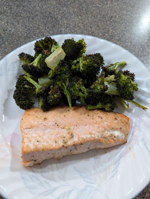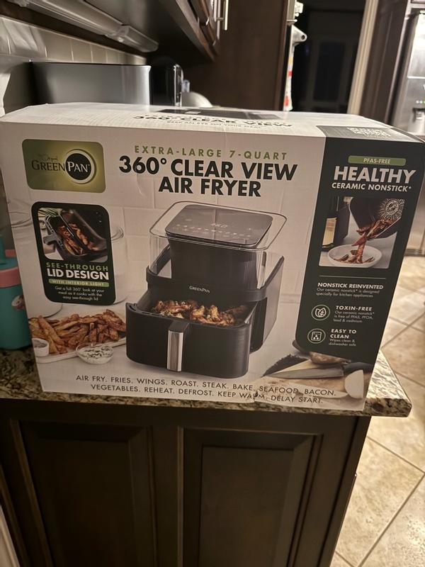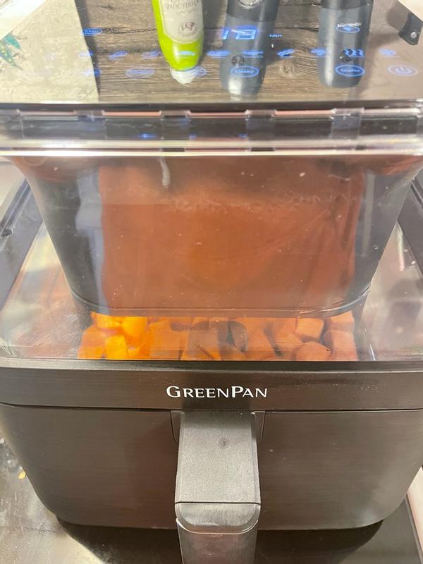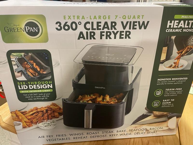 So in love with this GreenPan air fryer! My first air fryer ever and I definitely chose a winner. Love the look of it and how I can see how everything is cooking from the top (see my third picture for a view of a potato I threw in to get a sense of it). The 7 quart capacity is amazing - but it does mean this takes up a decent amount of real estate on your counter, it's a bit over a foot square - and I really love that it's pfas free nonstick. Was ready to go basically out of the box, and easy to clean. I made salmon and broccoli and it was amazing, perfectly cooked, and super fast!