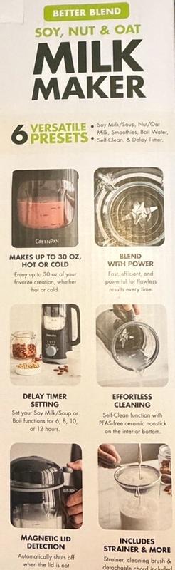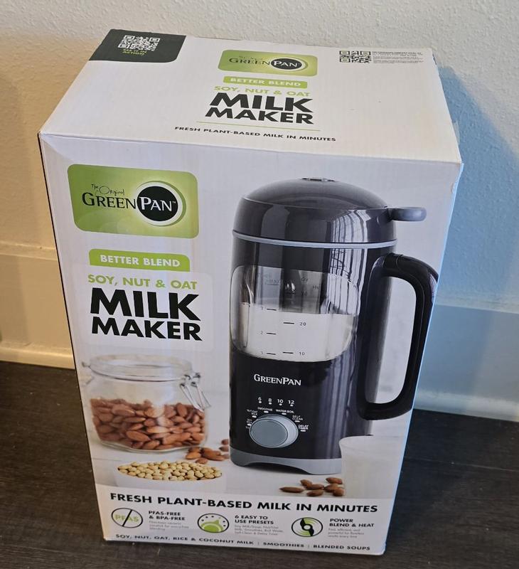 I really like this GreenPan nut milk maker. Now we can make Soy, Almond, Oat milk at home. Cleaning is easy and noise is minimal. No more buying milk in store! It even makes baby food! Would definitely recommend!