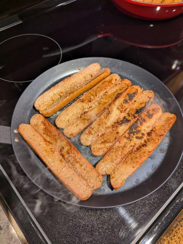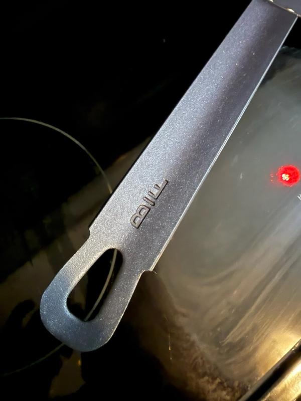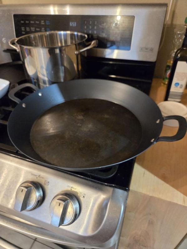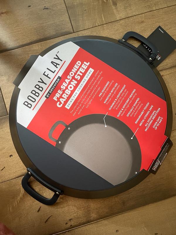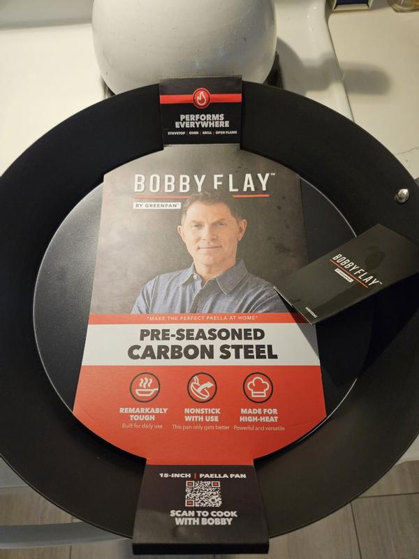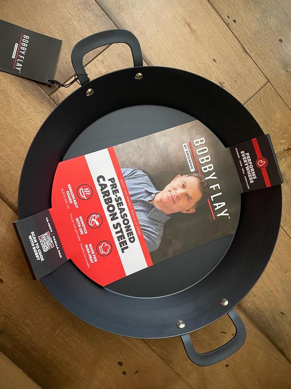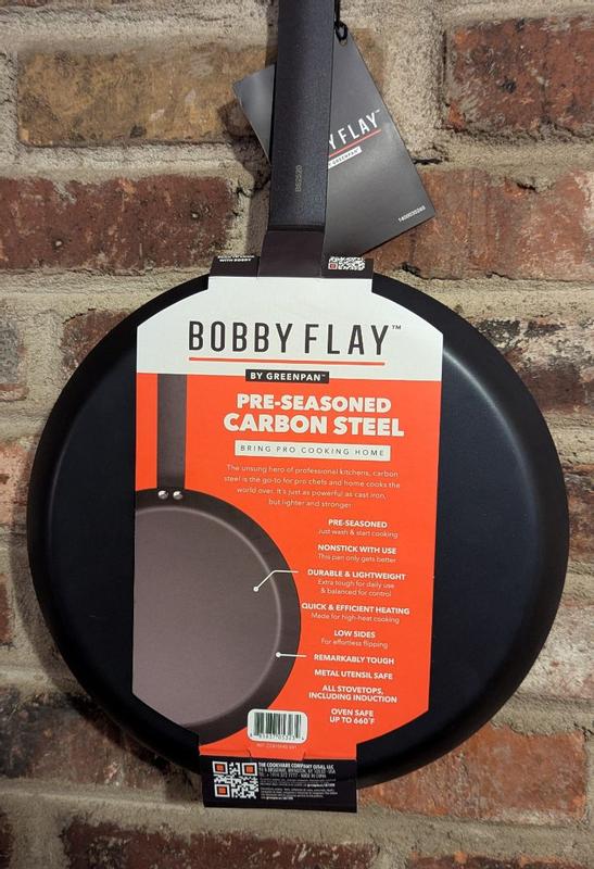 The Bobby Flay carbon steel frypan is a reliable sturdy lightweight pan for everyday use. It's great for dishes that start on the stovetop and finish in the oven or under the broiler since it is safe up to 600 degrees. It was preconditioned so no food sticking on the first use. I do wish it had a smoother handle finish for comfort, but this is a minor quibble.