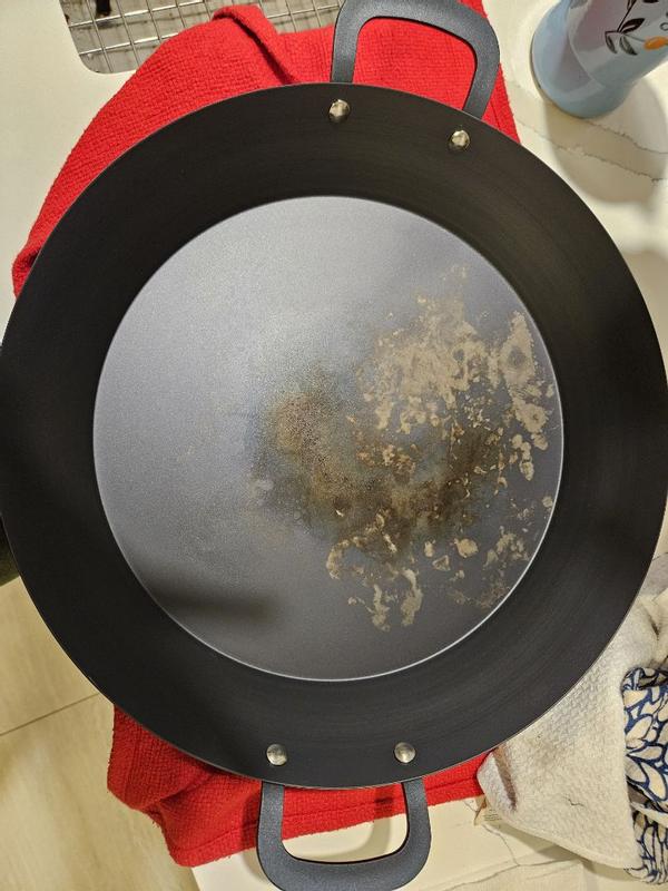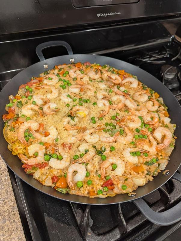 I feel awful about not having a picture but it's because of my no phone during meal times. But this pan is incredible! Durable, very large, you may need help moving it as it's quite heavy. Extremely easy to clean, just follow the directions! I've made haluski, roast & potatoes, chicken parm, even grilled cheese! This would make a wonderful bridal shower, wedding gift or a new house gift. My family doesn't care for paella but this pan is so versatile I can see myself using it for many different meals!