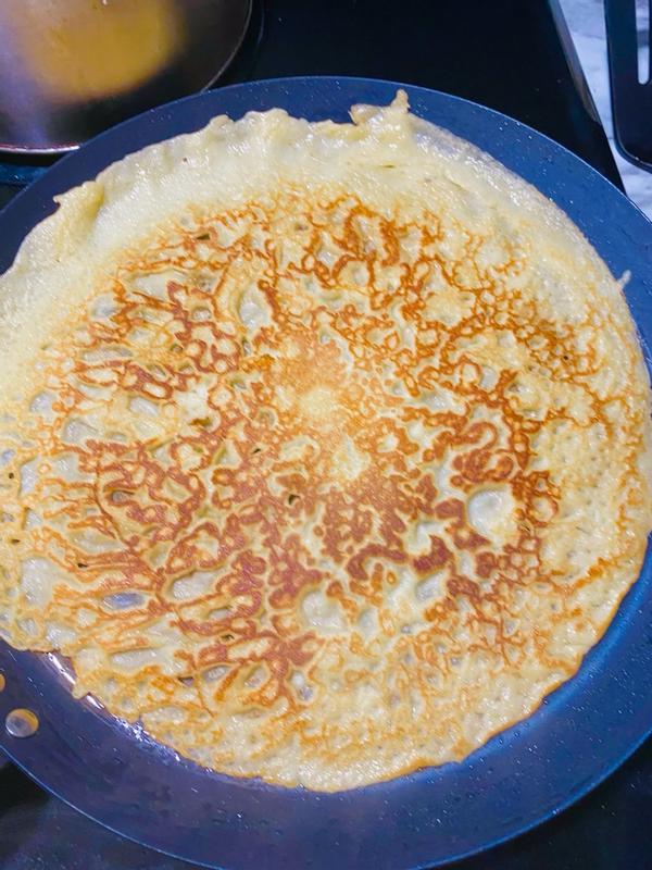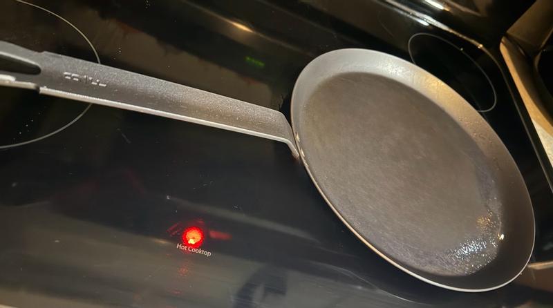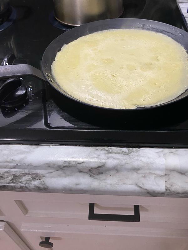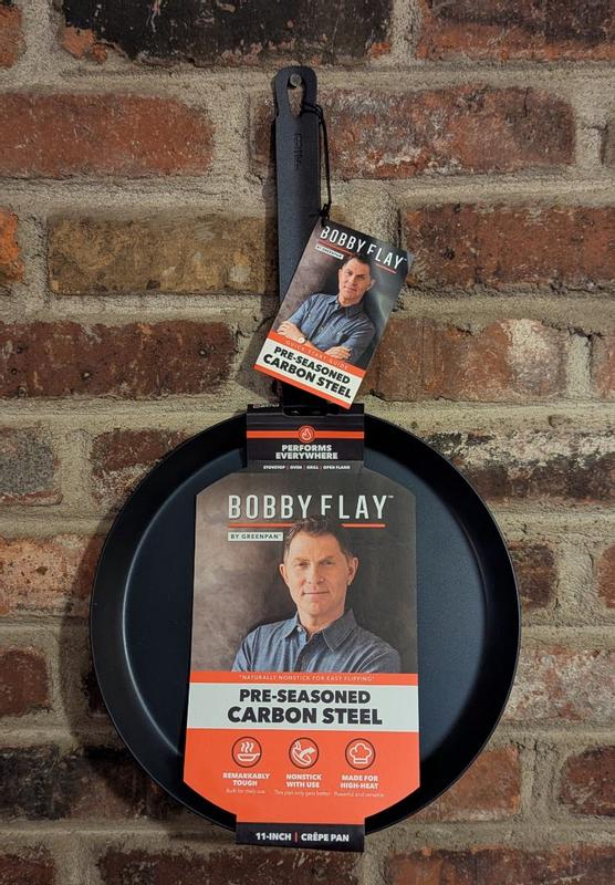 As a crepe making novice I thoroughly enjoyed using this Bobby Flay by Greenspan 11” Carbon Steel Crepe Pan. It gets hot and maintains even heat beautifully. Even my husband couldn’t resist trying it out. It’s weighty but still easily handled with one hand. Just rent to oil it after washing and it will keep looking good.