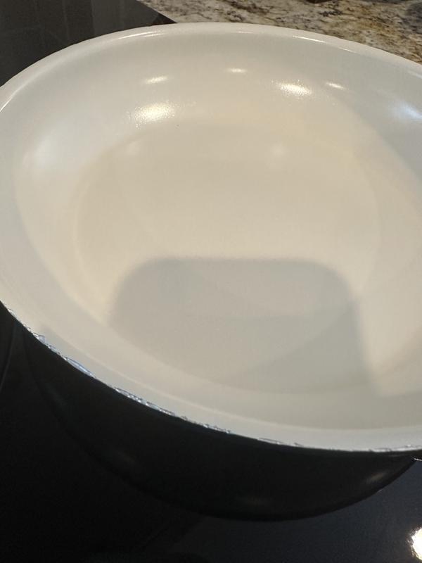 The enamel scratches off with the most gentle use (plastic/wood spoons) it gets into all of your families food - I have been forced to throw out large meals because of this - if you care about your health, avoid this product
