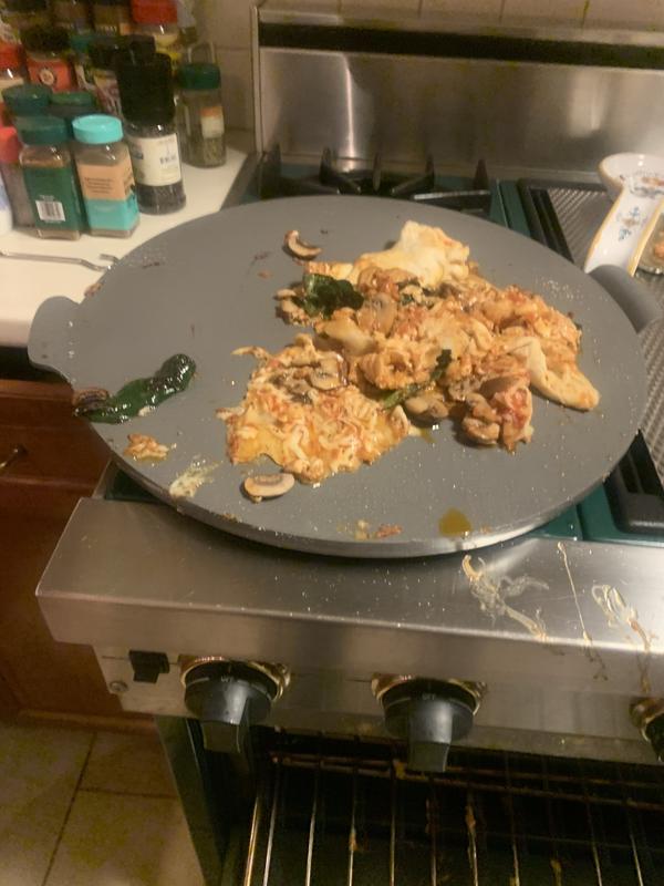 The first pizza we made on this pan was a disaster. As I was removing it from the oven it slid right off, all over my oven and floor. I’ve made many pizzas on other pans and never had this happen. The surface is way too slick for pizza. Terrible product.