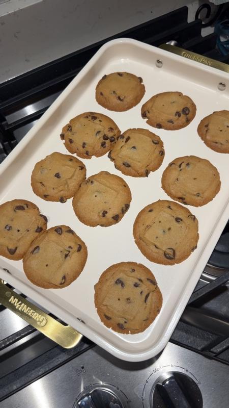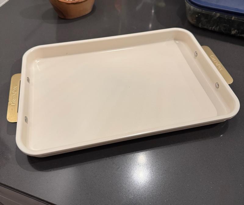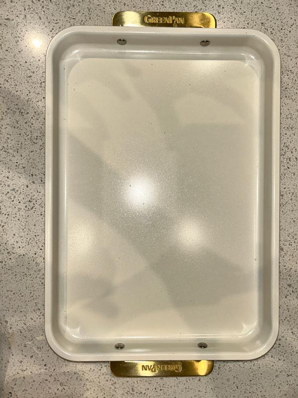 After the first and only use, my brand new bake sheet finish looks like this! From use in a brand new oven also used the first time. This shouldn’t happen. The finish just should not be so delicate as to be this damaged from normal use, once. Really makes me concerned for how the nonstick ceramic finish will hold up. I hate it when my gear doesn’t look fresh and new and go out of my way to keep it looking that way.