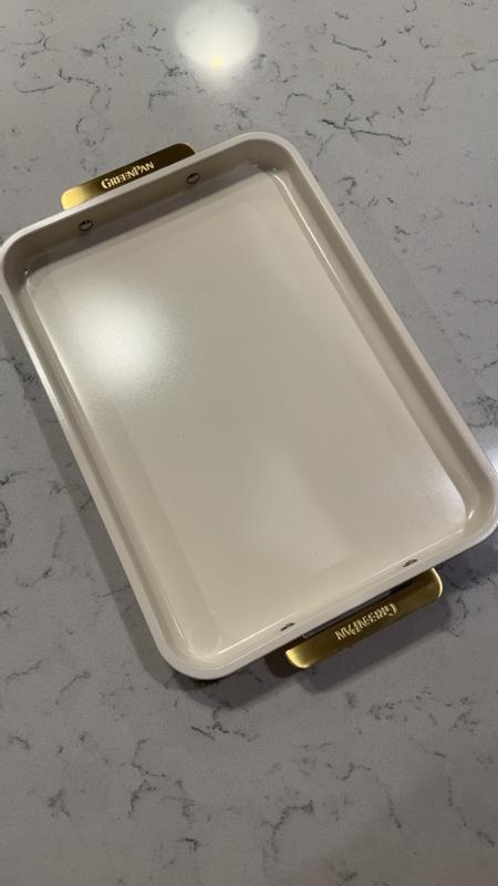 Beautiful 9 x 13 and I love that it is nonstick. I would highly recommend this product and all the other Green Pan products because I have purchased several and will more!