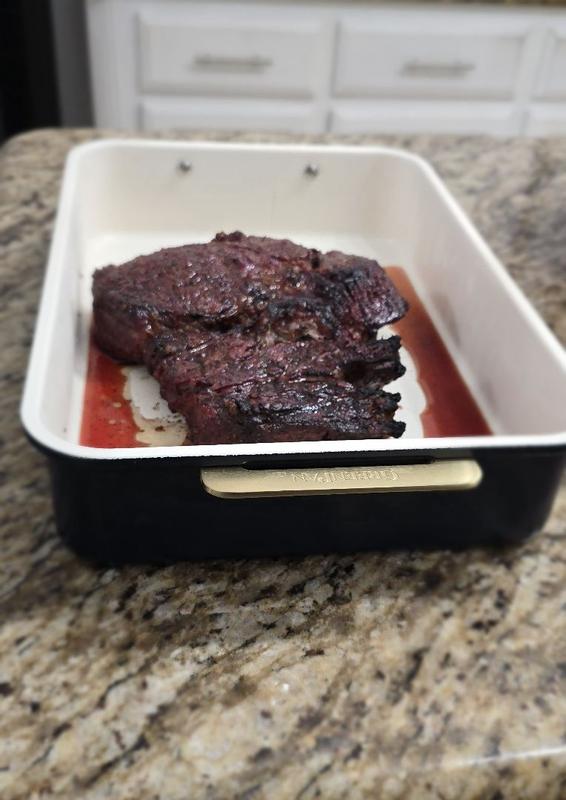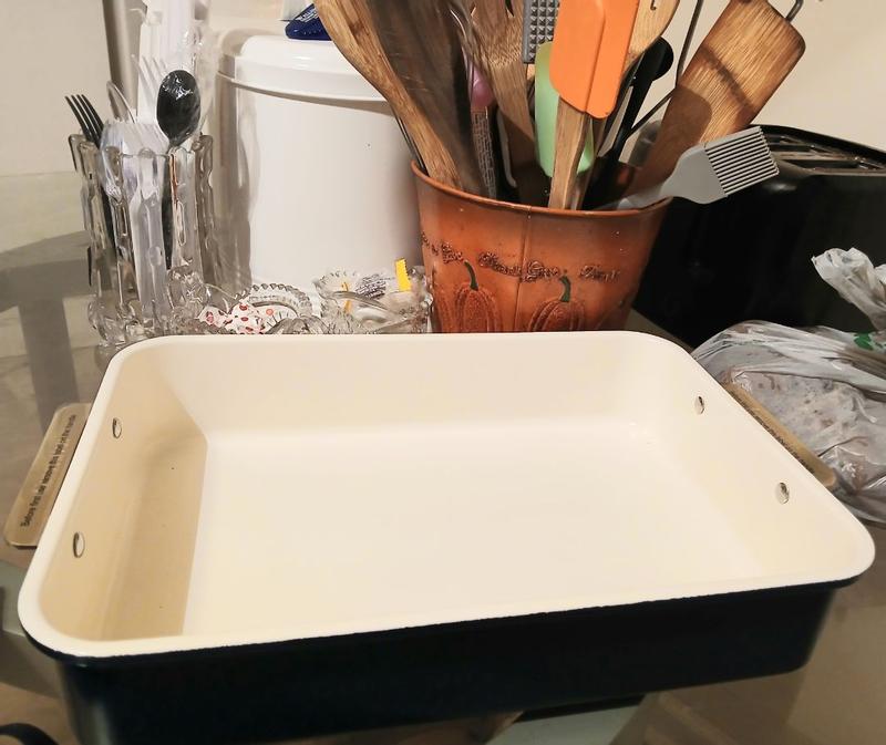 Nice sturdy baking pan, easy to clean, heavy duty, it did warp when baking fish at 400 F for 12 minutes, luckily the shape restored after cooling down. It’s a nice bakeware piece overall.