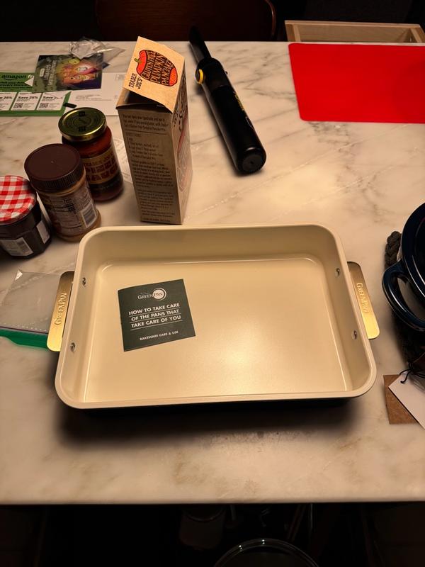 After nearly 50 years of marriage my baking pan collection was looking tired and warn. I treated myself to this wonderful set and have used it again and again. I love the nonstick feature of these pans and even when I use a little butter or oil to grease them, they work perfectly. Cleanup is quick. I love that the pans come with felt dividers so I can stack them without worrying about scratching the finish. Thank you, Greenpan for making this healthy bakeware!