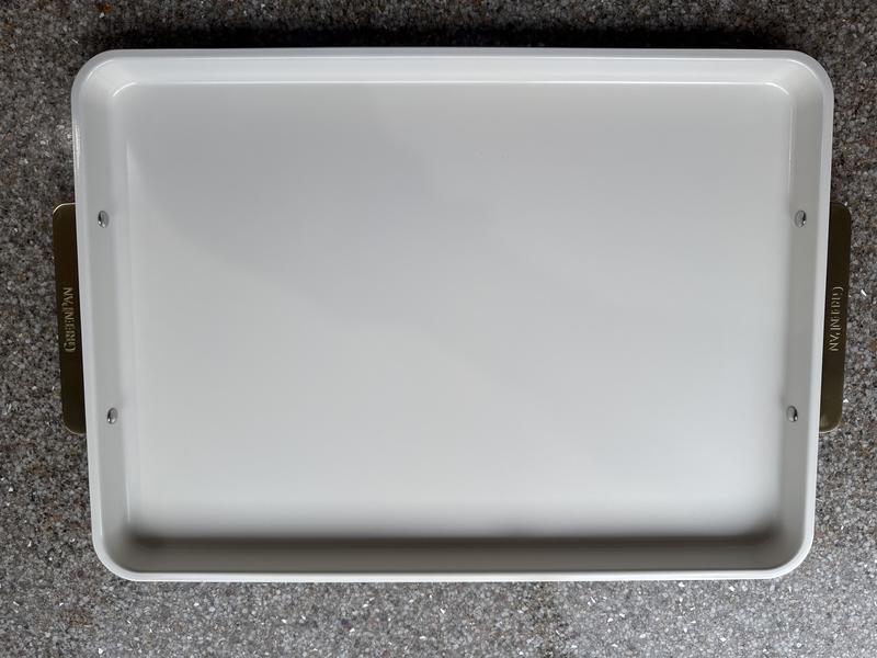 Love the look of my new Green Pan cookie sheet. The gold handles, navy edges and off white surface looks so elegant that I want to display it. Washes easily after use and my cookies turned out great! I highly recommend this pan.